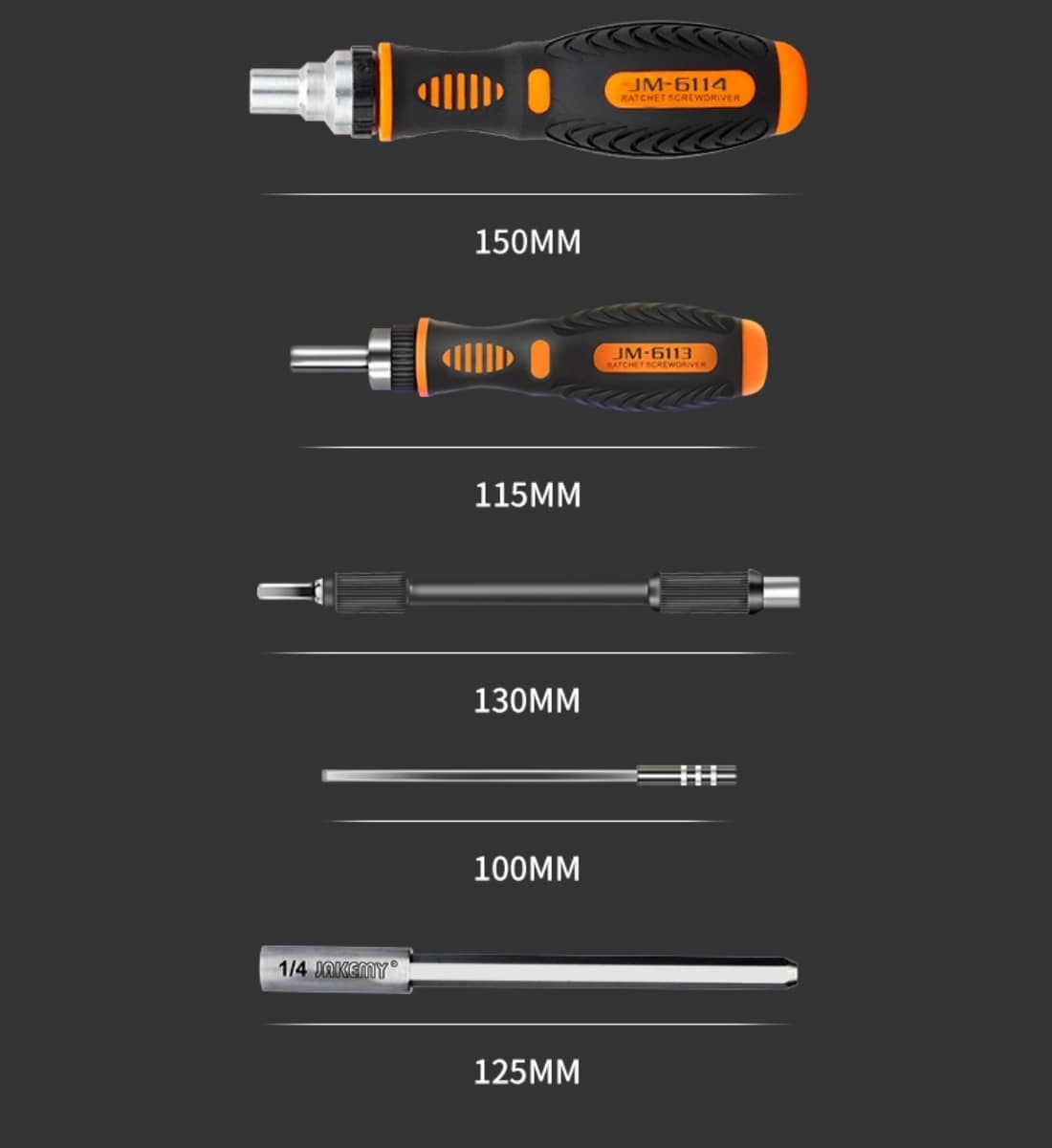 Малая ручка оснащена сильным магнитным битом и храповым механизмом с тремя передачами. Большая ручка также с храповым механизмом с четырьмя передачами что делает ручку отвертки еще более удобной для работы с крупной техникой или мебельной фурнитурой. Сами ручки на отвертках выполнены в противоскользящем дизайне. Дополнительные удлиняющие насадки делают отвертку длиннее практически в два раза, а гибкая удлиняющая насадка будет очень кстати, если необходимо что-то открутить или закрутить в трудно доступном месте.