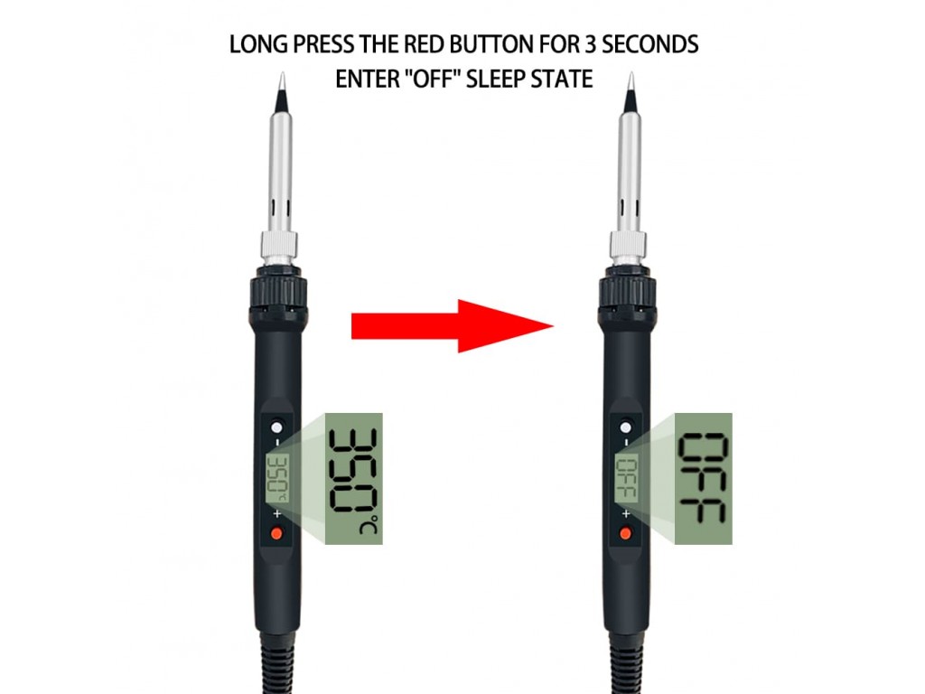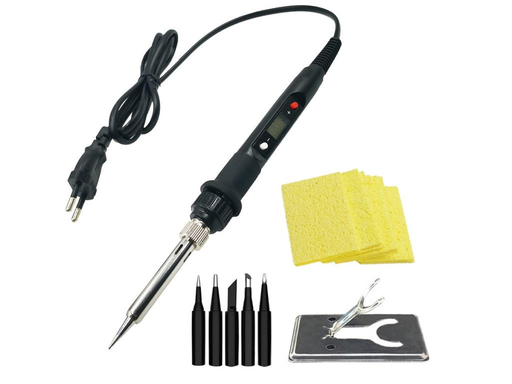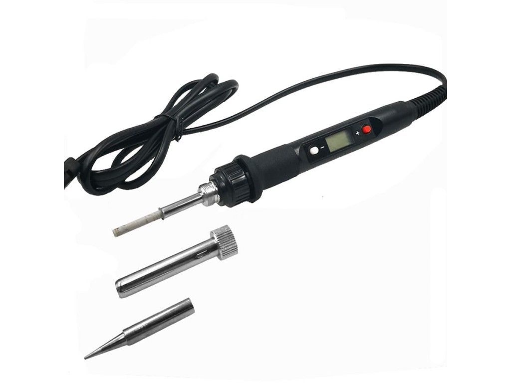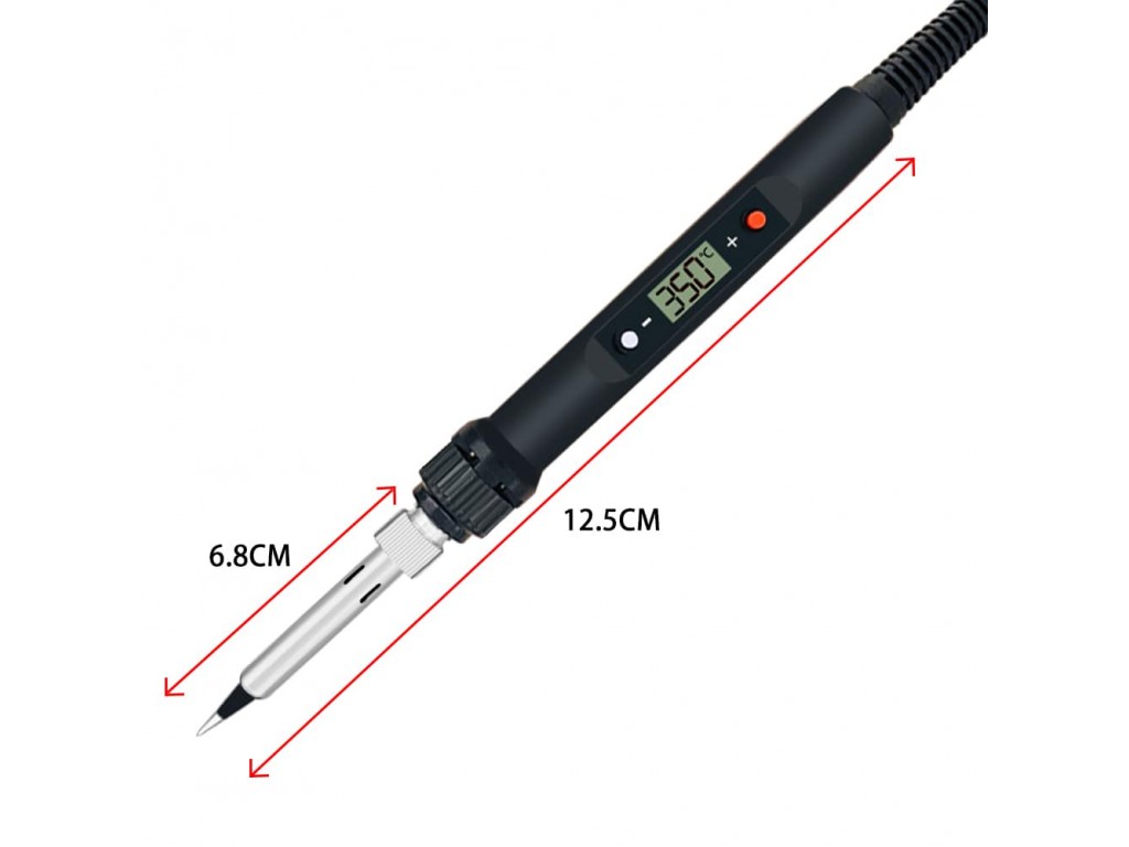 Мощность паяльника составляет 80 ватт и длина провода 140см с европейской вилкой под 220в. Общая длинна паяльника составляет 12.5см и длинна рабочей части всего 7см, что делает этот паяльник достаточно комфортным для повседневной работы. Отличительной чертой данной модели является наличие цифрового LCD дисплея отражающего рабочую температуру паяльника.