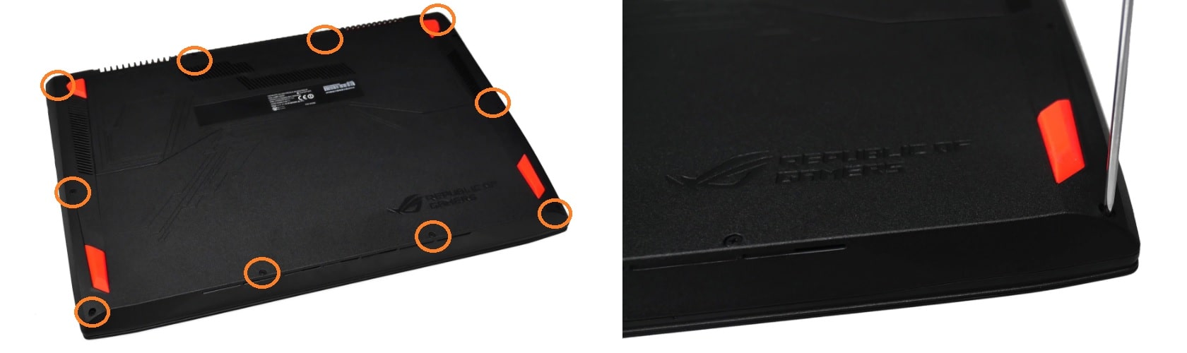 К сожалению, конкретно на этой модели обновить вы сможете не так много всего. Потому что, все ресурсы этого ноутбука исчерпаны, за исключением одного хранилища. Специально для вас я подготовил краткое руководство по разборке и апгрейду ноутбука Asus ROG Strix GL502. Для начала вам понадобится снять заднюю крышку. Для этого открутите 10 винтиков, которые расположены по периметру корпуса ноутбука. Старайтесь запомнить от куда какие винты, чтоб не перепутать.