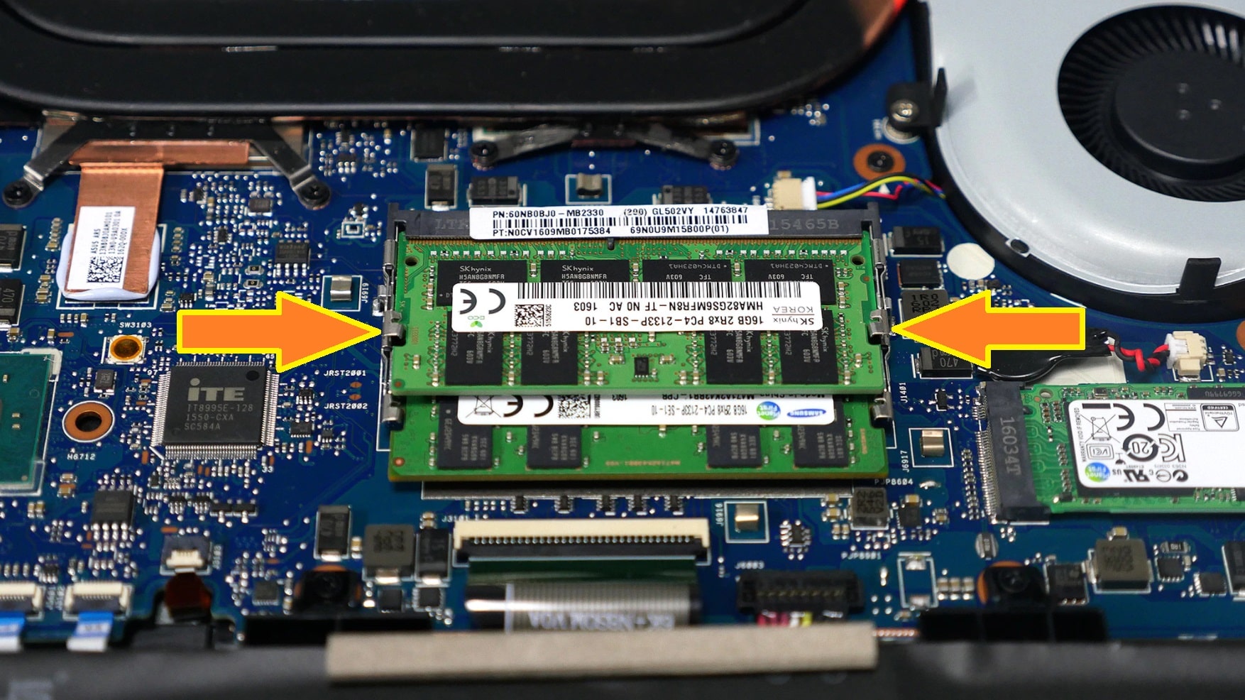 ROG Strix GL502VY поддерживает до 32ГБ памяти DDR4 (2133 МГц) SO-DIMM (два модуля по 16ГБ), в то время как GL502VT поддерживает до 16ГБ (два модуля по 8ГБ). Устанавливаются они один поверх другого. Поэтому сначала убедитесь, что вы установили нижний модуль и только потом приступайте к установке верхнего. Совместите контакты, чтобы убедится, что модуль установлен правильно.
