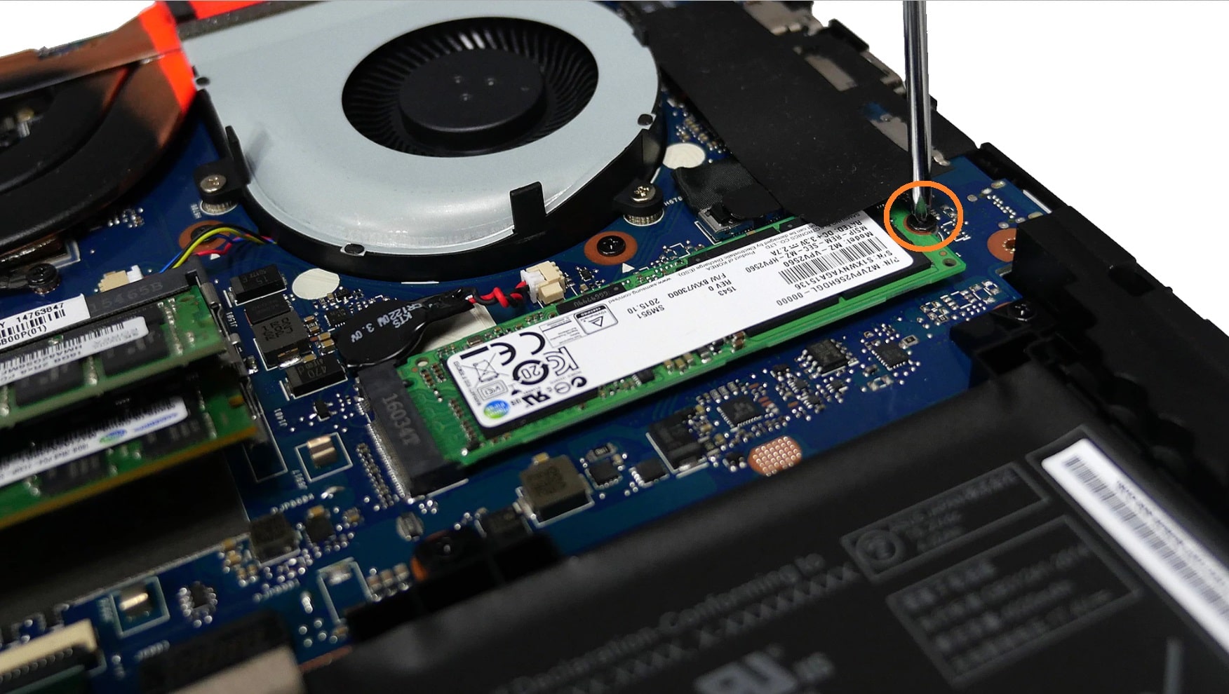 Установка SSD M.2 аналогична установке памяти, однако механизм блокировки – это винт. GL502 позволяет использовать накопитель NVME M.2 PCIe 3.0 X4, который может быть более чем в три раза быстрее, чем накопители SATA, поэтому обязательно используйте его в качестве загрузочного диска и для хранения любимых игр. Просто вставьте SSD в слот и закрепите его винтом.