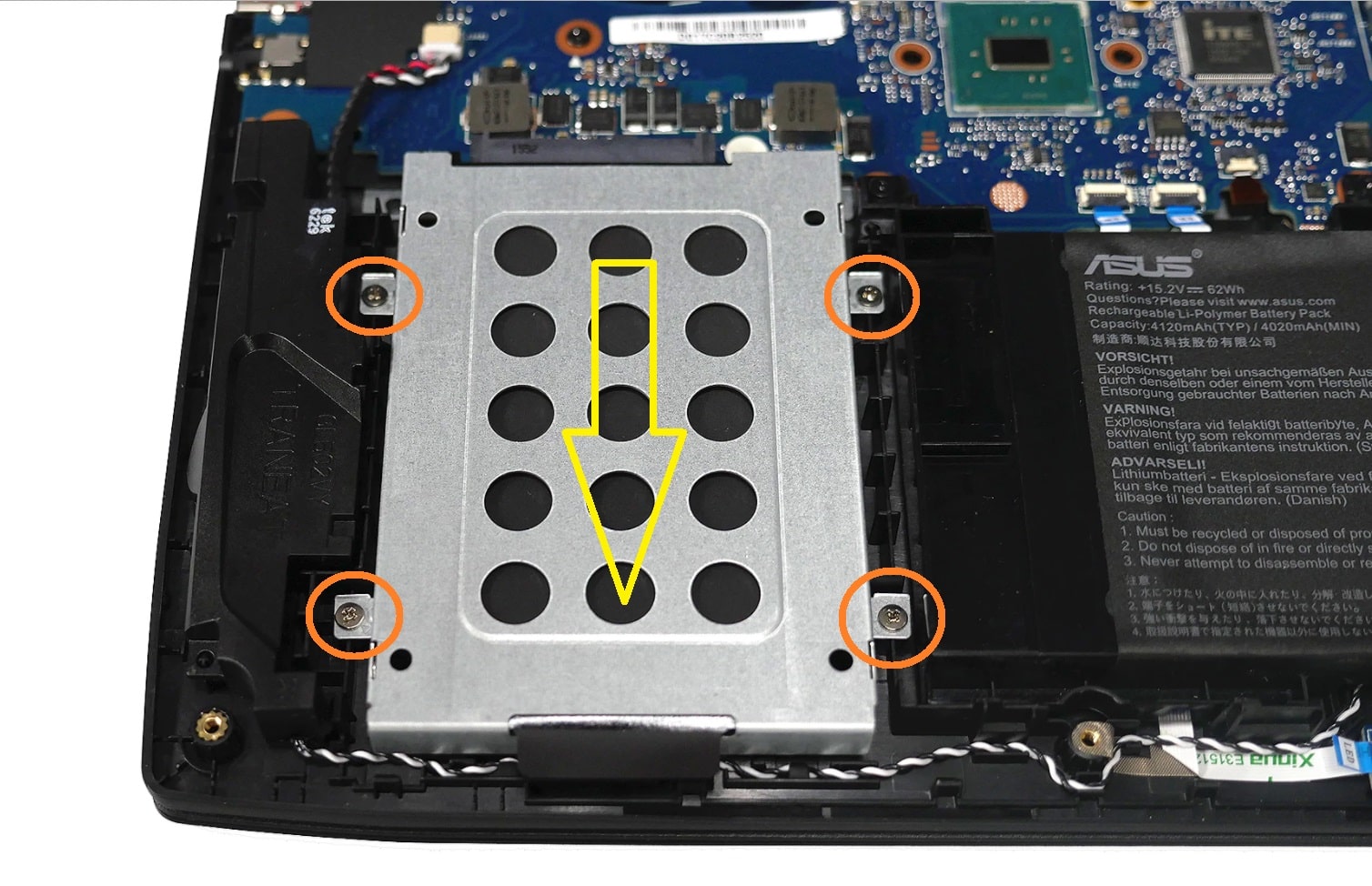 2,5-дюймовый жесткий диск SATA III можно заменить на больший или более быстрый жесткий диск или SSD. Для этого открутите четыре винта, которые фиксируют кронштейн. Сдвиньте кронштейн на себя, чтобы снять его. Прежде чем закрепить новый SSD в кронштейне, убедитесь, что он направлен вверх, посмотрите на разъёмы и убедитесь, что они совпадают. Если все хорошо, закрепите кронштейн с SSD обратно в ноутбук.