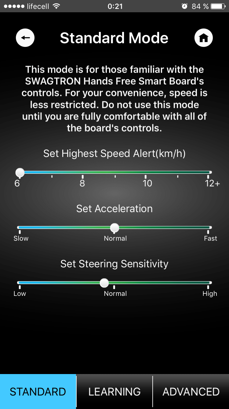 В этом разделе предоставлены самые интересные и гибкие настройки по управлению гироскутером свагтрон т6, есть выбор как для учащихся, так и для продвинутых пользователей. Тут предоставляется гибкая настройка максимальной скорости, настройка ускорения гироборда от медленного до быстрого и так же можно установить чувствительность управления.