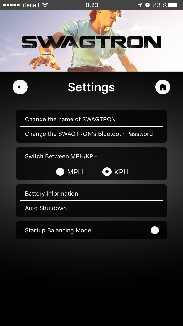 Разберём его более детальней. Активируем блютуз, запускаем приложение и выбираем SWAGTRON T6. При включении SWAGTRON T6 сразу автоматически балансируется, нет необходимости его вручную выравнивать, сразу становитесь и едите (даже если вы новичок). Далее коннектимся через блютуз с гироскутером и попадаем на экран с датчиком заряда батареи, скорости и настройками.