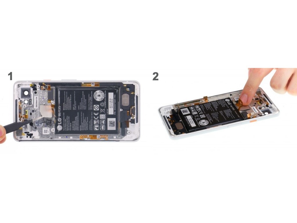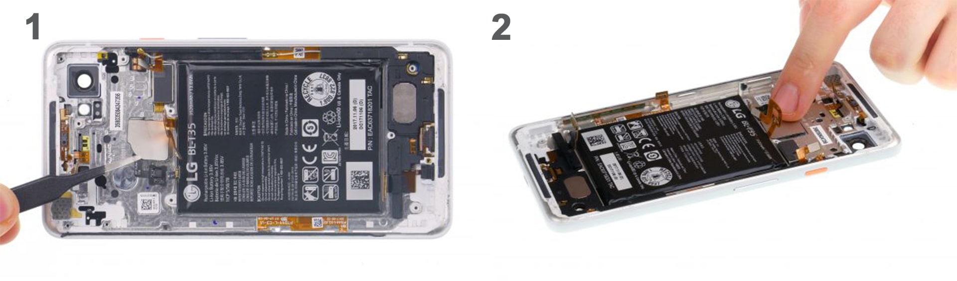 Теперь отсоедините дисплей. Под экраном есть два очень тонких гибких кабеля. Аккуратно сложите дисплей, чтобы не повредить их. Снимите пластиковую крышку, отмеченную «1», вставив пластиковую лопатку в зазор. Затем снимите крышку №. 2. Отключите оба разъема с помощью пластиковой лопатки. Будьте очень осторожны с нижним контактом. Рядом с разъемом на плате находятся компоненты, которые легко повредить. Теперь отложите дисплей в сторону. Как видите, дисплей очень хрупкий, а стеклянный экран не имеет дополнительной защиты, поэтому будьте очень осторожны.