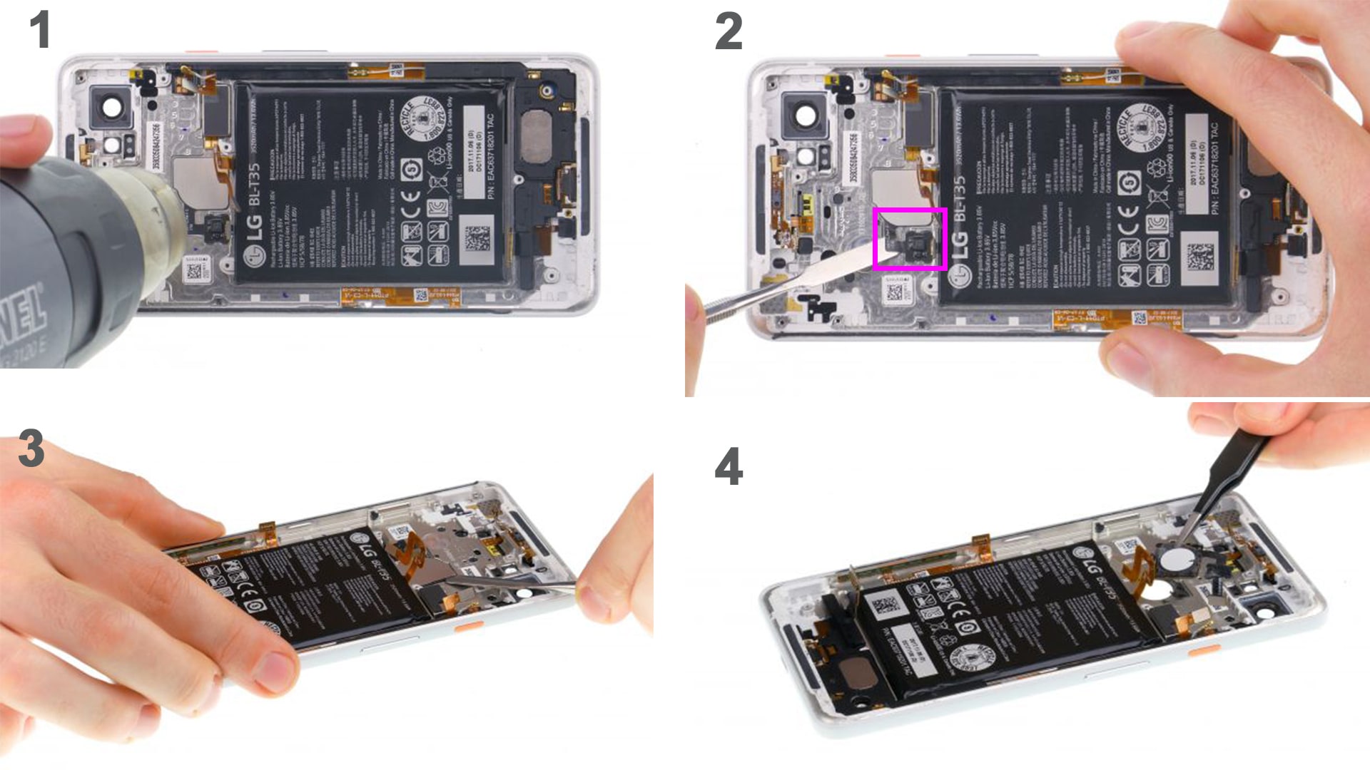 Нагрейте датчик отпечатков пальцев теплым воздухом с помощью обычного фена, чтобы смягчить клей. Вставьте лопатку под гибкий кабель датчика и извлеките его из корпуса. Далее извлеките сам датчик отпечатка пальца. Не нагревайте слишком горячим воздухом, так как датчик отпечатков пальцев находится прямо над аккумулятором. Нагревайте его периодически, чтобы не перегревать устройство.