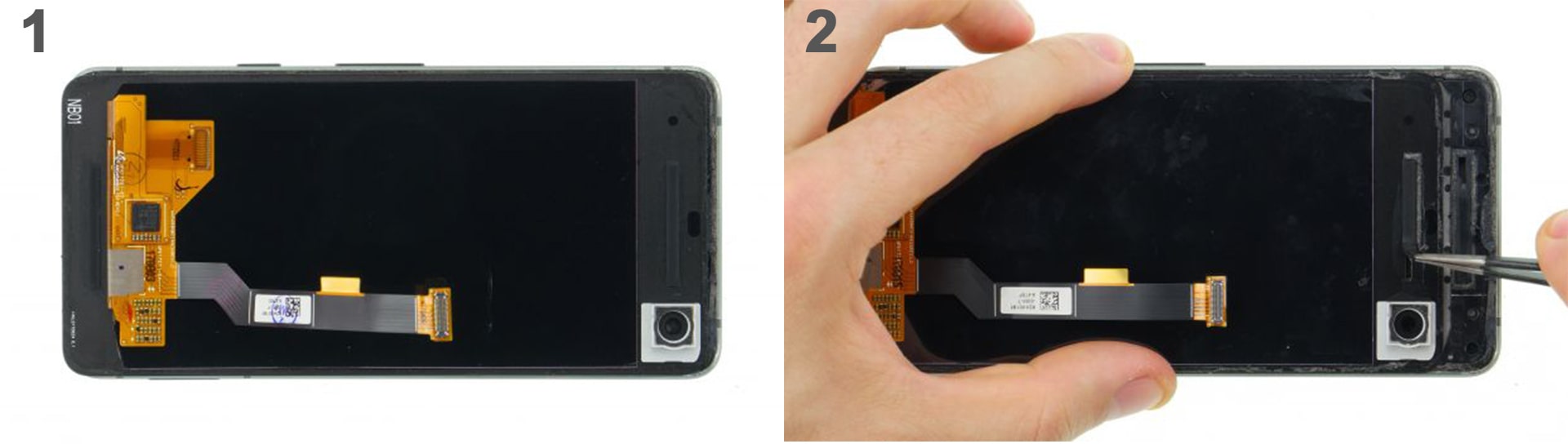 Теперь вам нужно снять дисплей. Экран очень легко повредить, поэтому нужно быть очень осторожными. Не вставляйте пластиковый медиатор более чем на 5 мм, также не используйте его в качестве рычага, посто проведите им по краю телефона, чтобы отклеить клей. Для начала хорошо прогорайте дисплей теплым воздухом с помощью фена. Затем вставьте пластиковый медиатор между дисплеем и рамкой. Чтобы предотвратить повторное склеивание частей устройства, вы можете использовать несколько медиаторов, вставив их в разные части корпуса. Когда вы полностью отклеите дисплей, осторожно снимите его. Обратите внимание, что гибкий кабель все еще подключен. Далее удалите остатки клея с рамы с помощью пинцета. Если дисплей был сильно разбит, наклейте на него липкую ленту, чтоб он не распадался на мелкие стеклянные осколки.