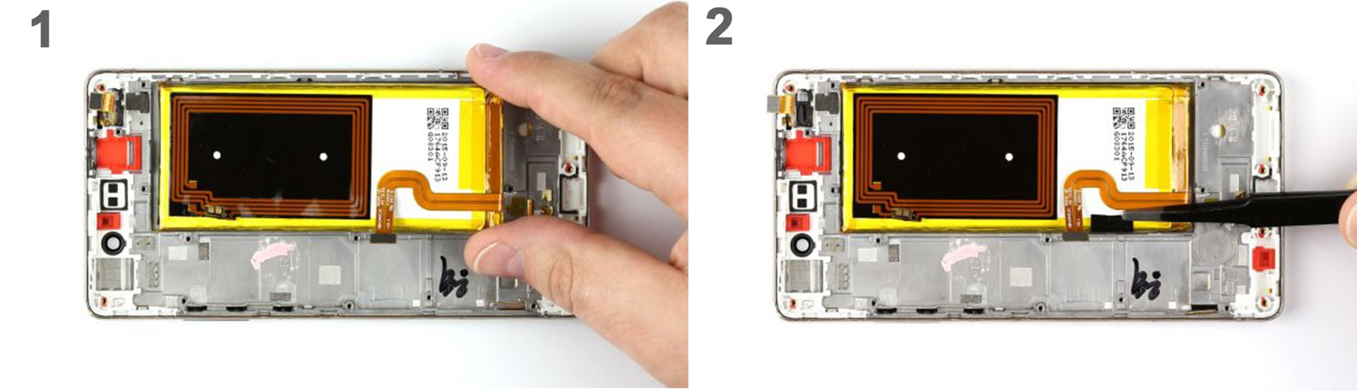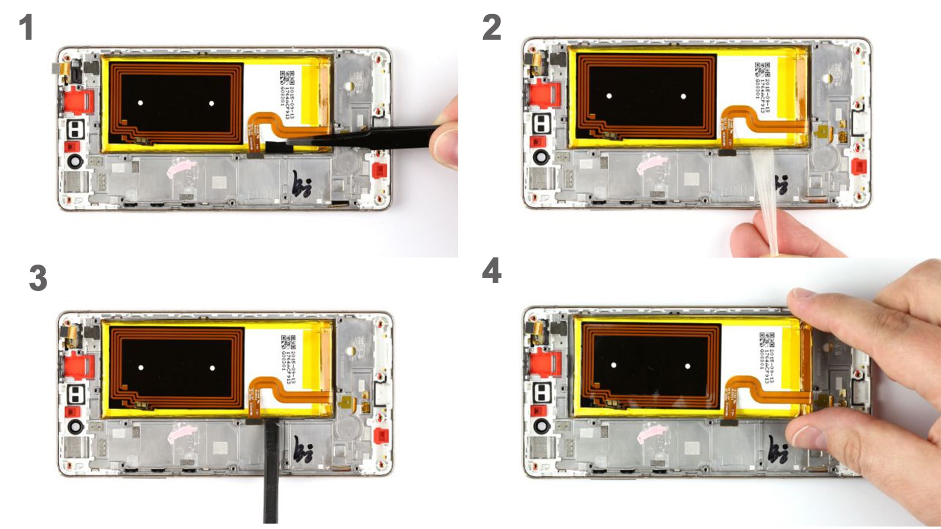 Аккумулятор хорошо приклеен к корпусу телефона. На боковой стороне батареи прикреплен черный язычок, за который можно извлечь из батареи. Потяните медленно, но не сильно и не резко. К нему прикреплена эластичная клейкая полоска. Продолжайте тянуть, пока не удалите всю клейкую ленту. Аккумулятор приклеен к корпусу в других местах. Чтобы отсоединить его, нужно аккуратно извлечь батарею.