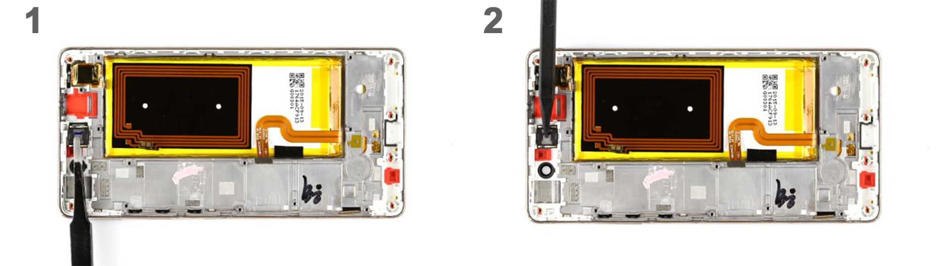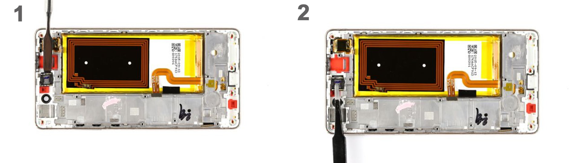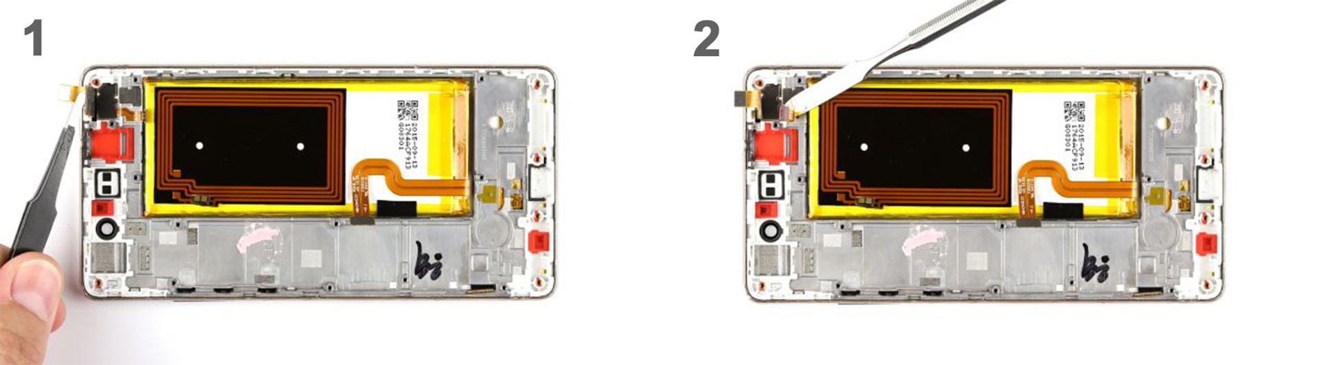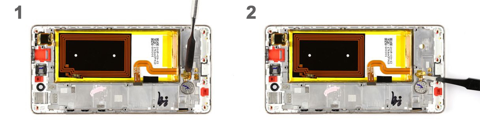 Далее открутите 7 винтиков, которые крепят крышку к устройству. Крышка состоит из двух частей. Осторожно снимите верхнюю крышку большего размера с помощью пинцета. Контакт антенны NFC приклеен к нижней части меньшей крышки. Переверните крышку, чтобы вы могли отсоединить контакт. Осторожно отсоедините контакт, Также снимите маленькую крышку.