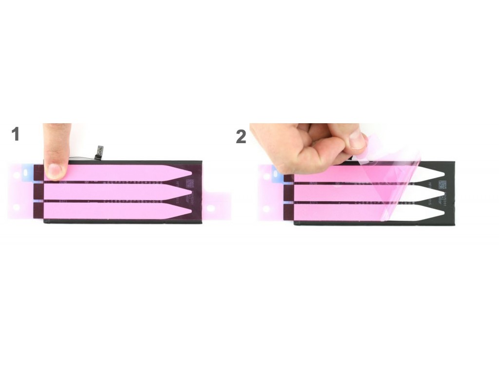 Теперь вам нужно подготовить новую батарею. Удалите синит защитную пленку с клейкой ленты батареи. Прикрепите клейкие полоски к задней части аккумулятора и плотно прижмите их. Снимите красную защитную пленку.