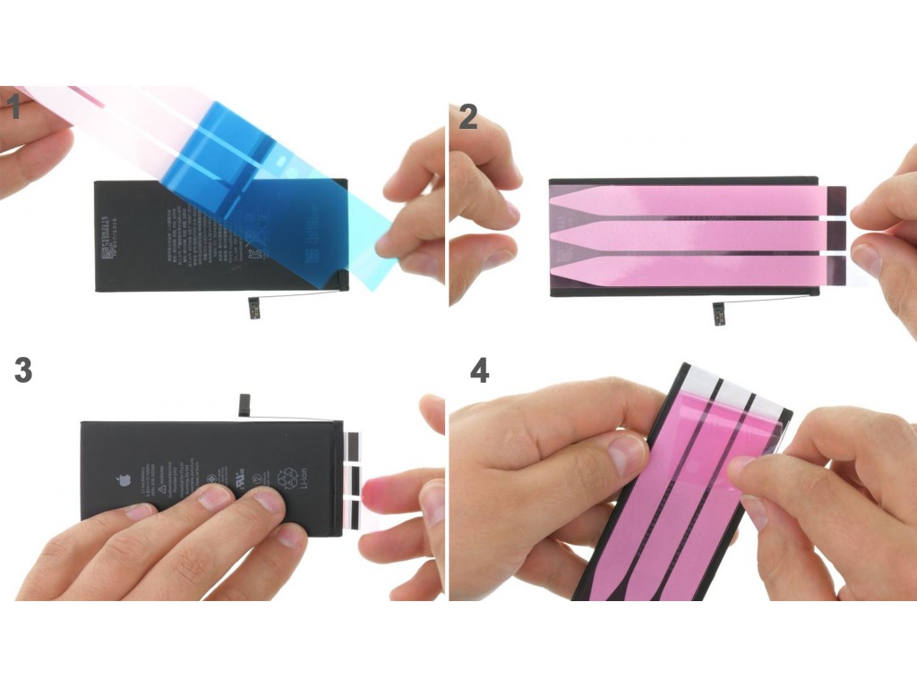 Теперь подготовьте новую батарею к установке. Поместите клейкие ленты с защитными пленками, прикрепленными к устройству, чтобы убедиться, что они направлены в правильном направлении. Удалите большую синюю защитную пленку и приклейте липкие полоски к нижней части батареи. Убедитесь, что они наклеены. Переверните аккумулятор и снимите маленькую синюю защитную пленку с выступов. Сложите вкладки и приклейте их к верхней части батареи. Удалите большие розовые защитные пленки с вкладок.