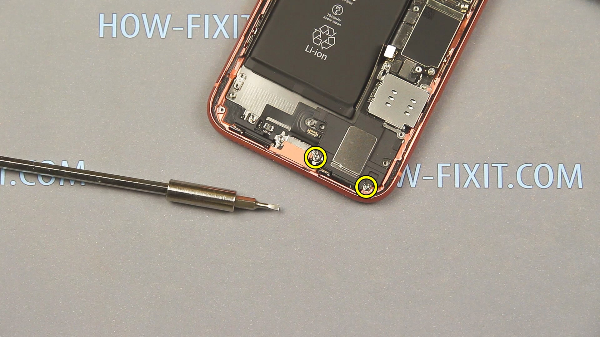 Перед разборкой выключаем айфон и извлекаем лоток с sim картой. Возле разъема для зарядки откручиваем 2 винтика с помощью пятизвездочной отвертки.