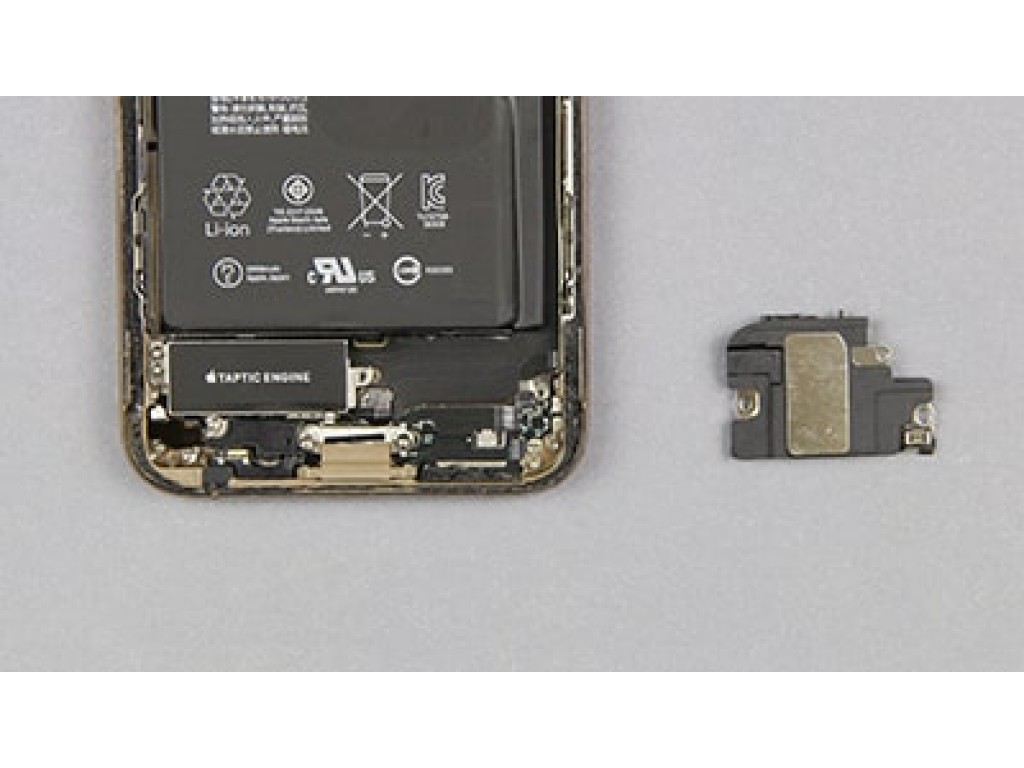 Чтобы заменить динамик в iPhone XS открутите 5 винтиков и снимите модуль антенны.