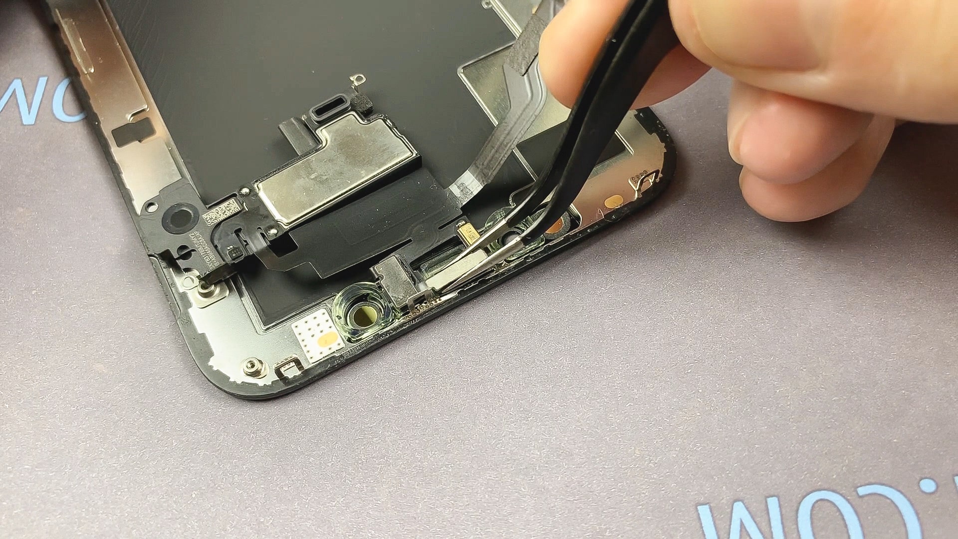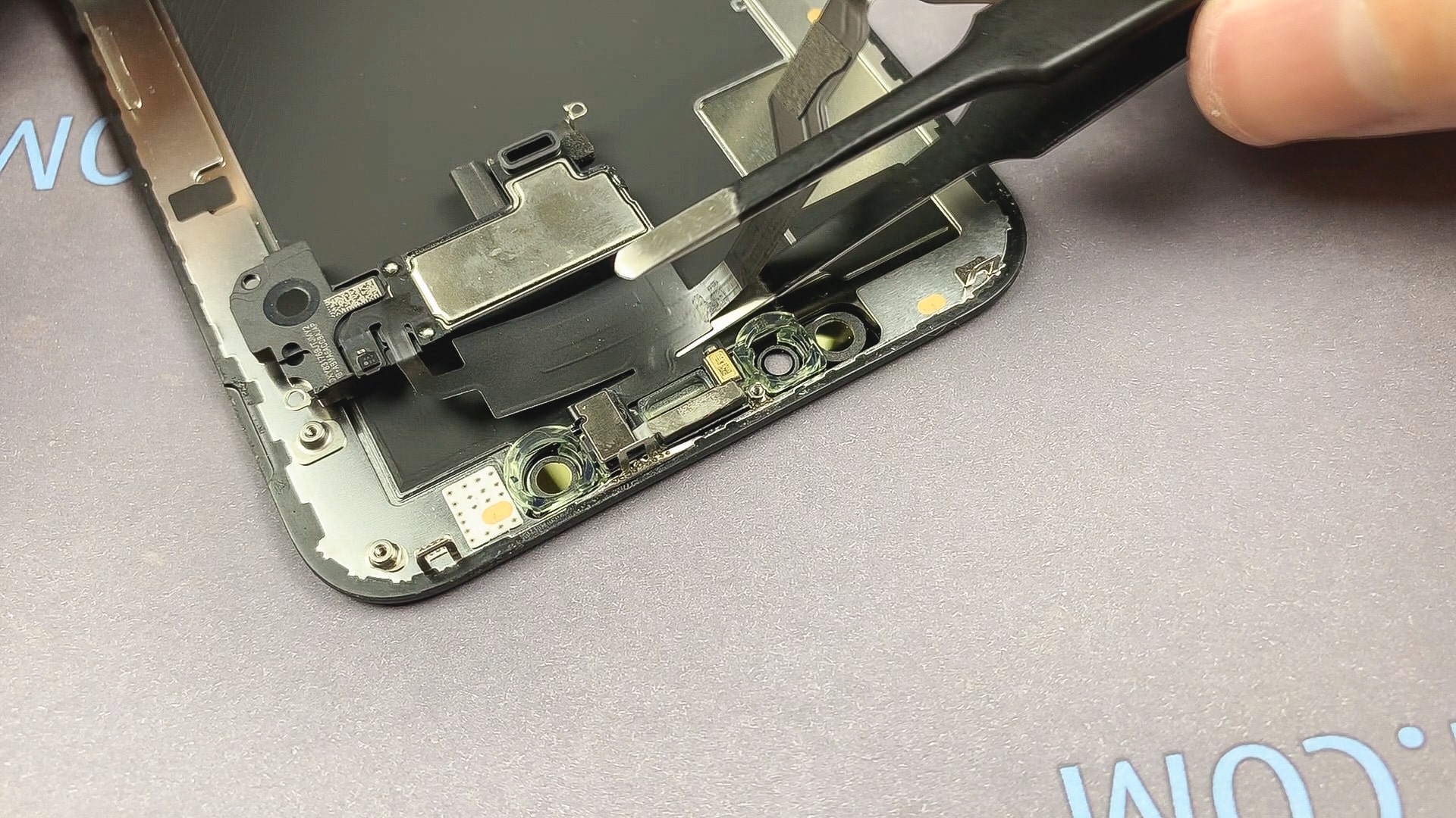 Для замены дисплея на iphone xs необходимо переставить слуховой динамик и датчики с оригинального дисплея на новый.