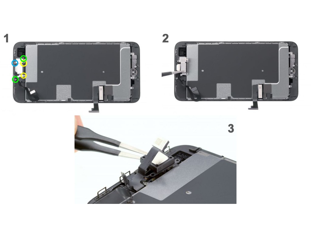 Слуховой динамик находится на задней панели дисплея. Открутите отмеченые винтики из крышки слухового динамика (голубой - 2.7 мм, зеленый - 1.7 мм, желтые - 2.2 мм). Слуховой динамик находится под гибким плоским кабелем фронтальной камеры. Слегка отогните кабель в сторону, чтобы снять наушник. Обратите внимание, что винты разной длины. Если перепутать их при обратной сборке, это может привести к повреждению дисплея.