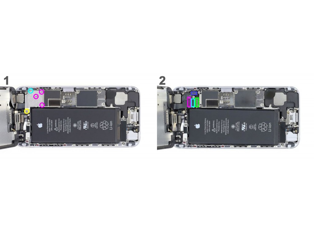 Теперь вам нужно открутить пять отмеченных винтиков Phillips из металической крышки (голубой - 3.1 мм, розовые - 1.3 мм, желтый - 1.8 мм). Далее снимите крышку. Отсоедините четыре разъема в порядке, указанном ниже. Будьте очень осторожны. Поместите конец пластиковой лопатки чуть ниже контакта и поднимите его. Таким образом отключите: фронтальную камеру/датчик приближения/слуховой динамик/микрофон (зеленый), сенсорный идентификационный кабель (синий), LCD (голубой), сенсорный экран (розовый).