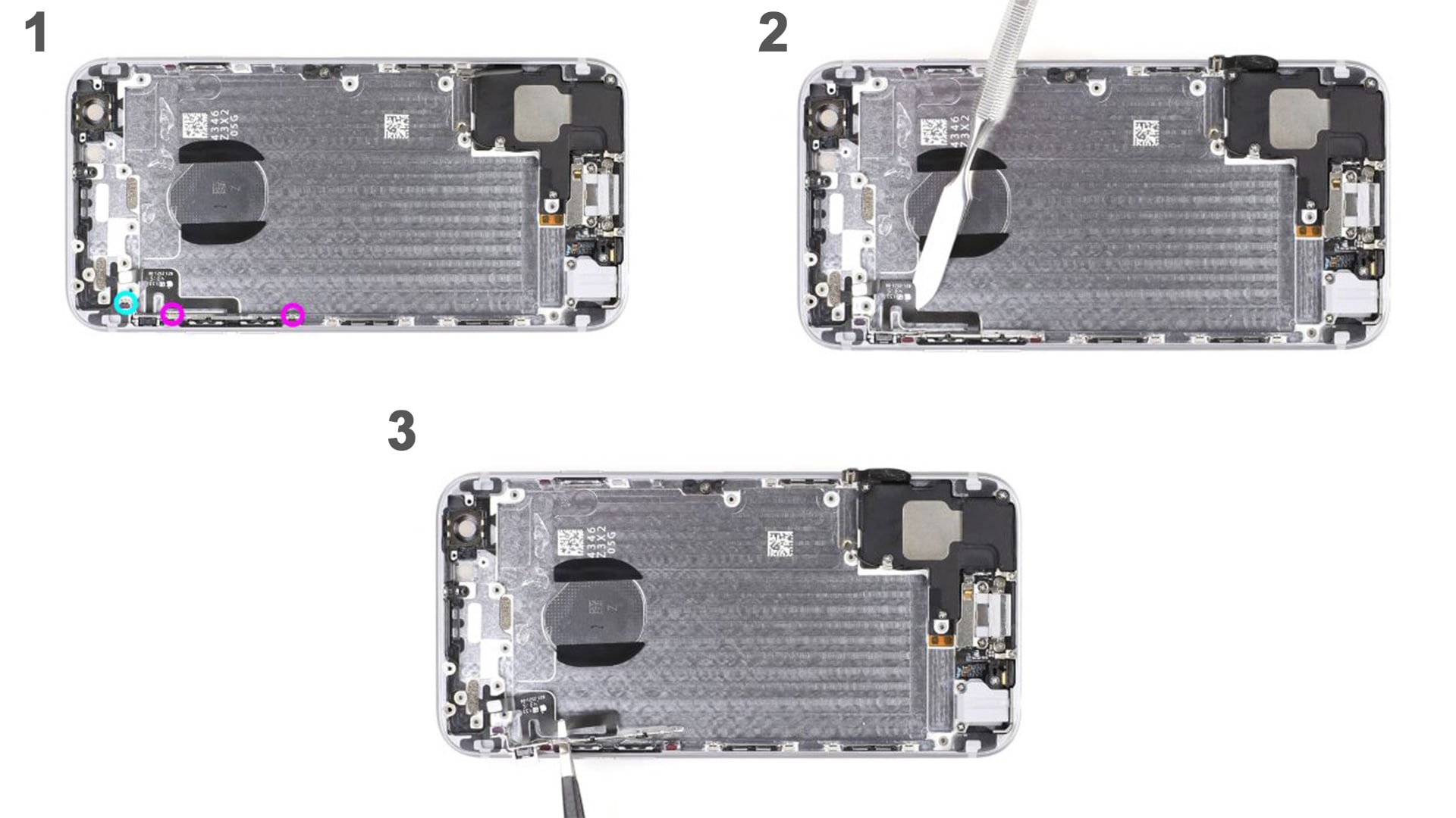 Установите динамик в исходное положение. Убедитесь, что он вставлен правильно и кабели с разъемами открыты. В этом процессе убедитесь, что антенный кабель с небольшим металлическим кольцом правильно установлен на динамик. Теперь вы можете закрутить отмеченные винты Philipps (розовые - 2.9 мм, голубые - 2.3 мм).