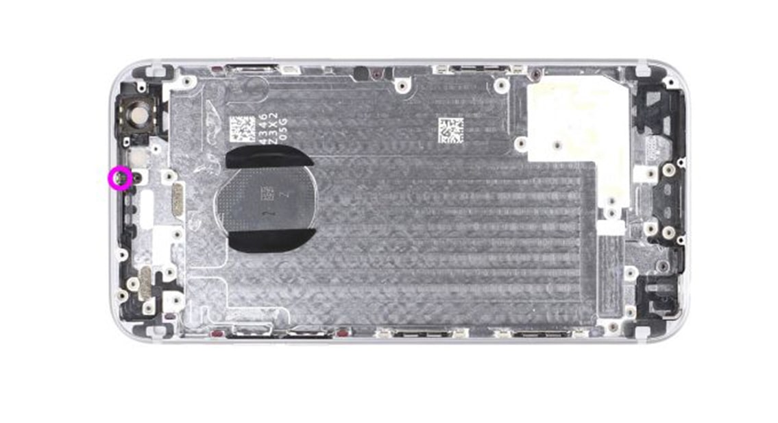 Далее вам нужно снять основную камеру. Откройте верхний винт в крышке камеры. Открутите два отмеченных винтика Phillips из крышки основной камеры (розовый - 1.6 мм, голубой - 2.1 мм). Теперь снимите металическую крышку. Затем отсоедините разъем основной камеры. Поместив плоский конец пластиковой лопатки чуть ниже контакта и подняв его. Теперь снимите основную камеру с телефона.