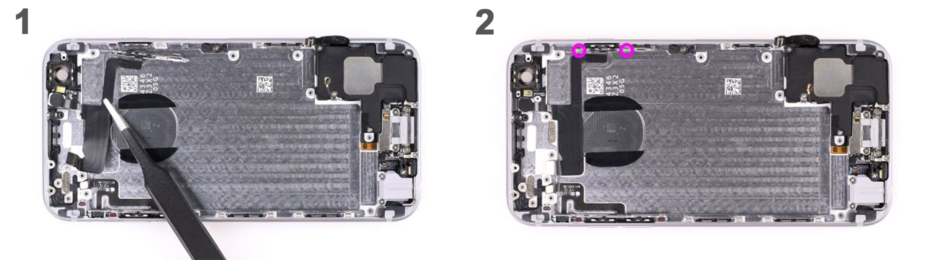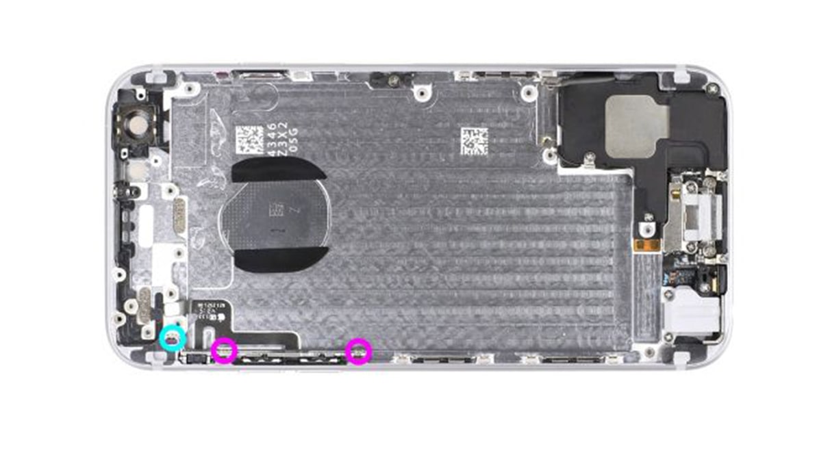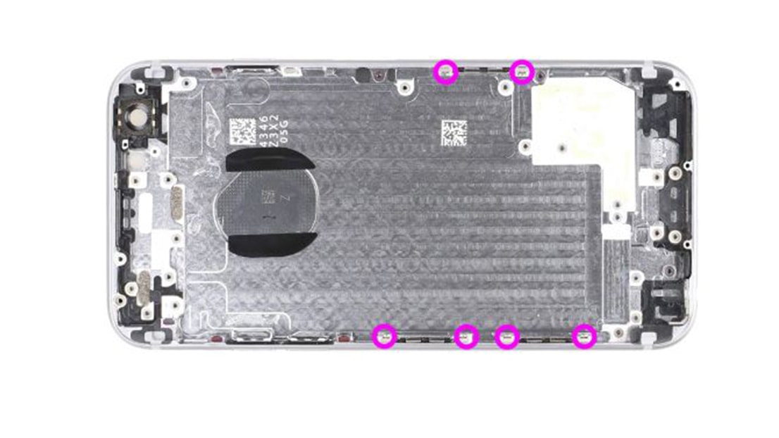Первым шагом вам нужно открыть iPhone. Для этого вам понадобится отвертка Pentalobe. Открутите два отмеченных винтика в нижней части корпуса (розовые - 3.8 мм).