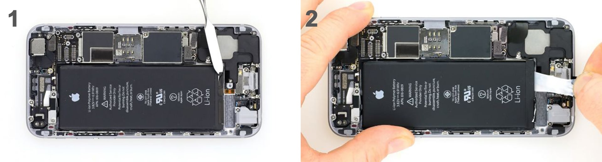 Аккумулятор крепится к корпусу двумя клейкими полосками. С помощью металической лопатки, отсоедините два черных конца клейкой ленты от батареи. Теперь очень медленно вытащите клейкие полоски. Тяните за полоски как можно более параллельно вашему телефону. Далее извлеките батарею из корпуса.