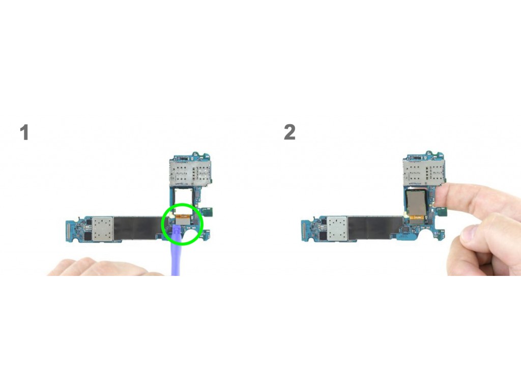 Теперь вам нужно снять материнскую плату. Нижняя часть материнской платы подключена к USB-порту. Аккуратно отклоните плату на 180 °, чтобы вы могли добраться до контакта. Не тяните слишком сильно за материнскую плату. Используя пластиковый спаджер, аккуратно отсоедините контакт от платы. Снимите материнскую плату. В отверстии лотка для SIM-карты есть маленький пластиковый штифт. Удостоверьтесь, что он не выпал.