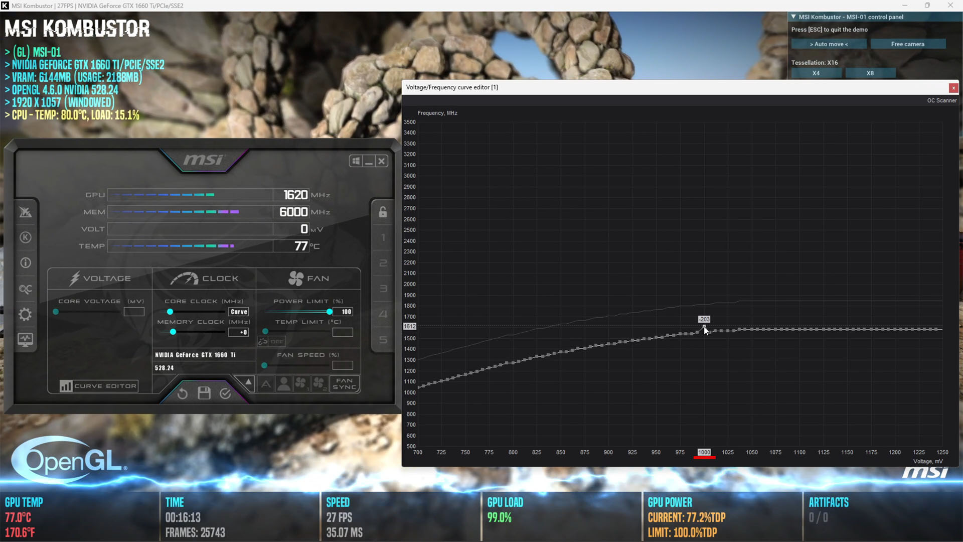 - Запустите стресс тест. MSI Kombustor максимально загрузит графический процессор и мы узнаем на какой частоте он работает. После 15ти минут стресс теста, при 100% нагрузке, графический процессор достиг максимальной рабочей частоты, в моем случае это 1620Mhz, у вас показатели будут отличаться от моих. Температура графического процессора 77 °C при скорости 27 FPS.