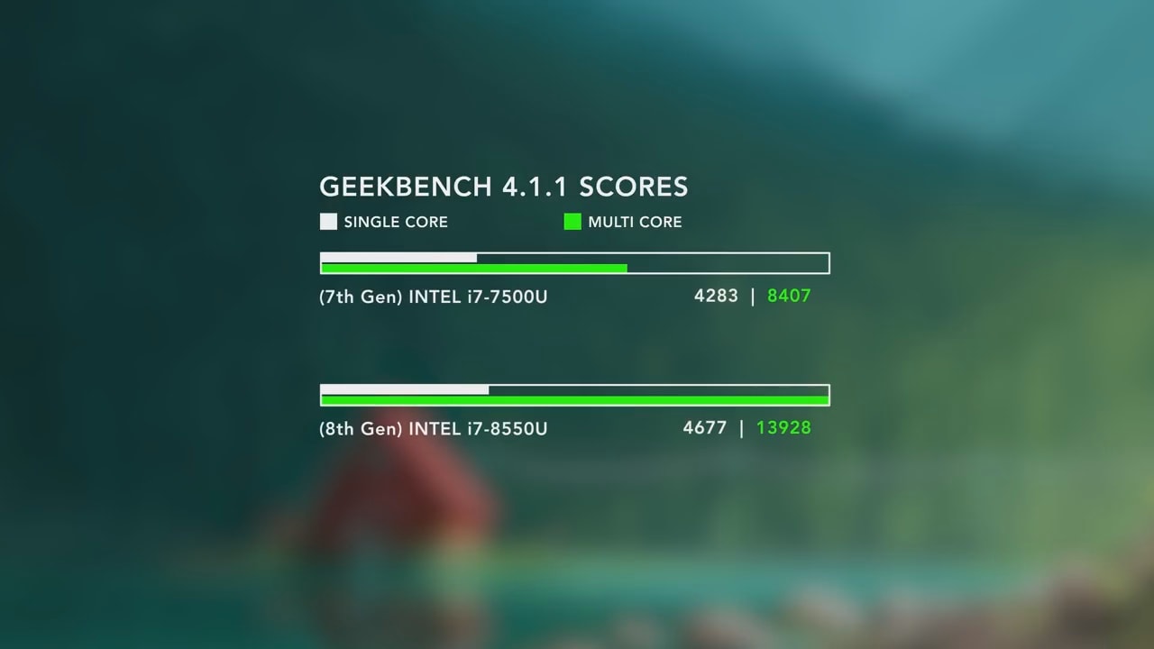 У моєму випадку використовувалася модель з процесором Core i7 Kaby lake-R восьмого покоління з 16GB оперативної пам'яті. Як бачите по графічному малюнку, Core i7 восьмого покоління в мультипроцесорної режимі значно перевершує по продуктивності Core i7 сьомого покоління.