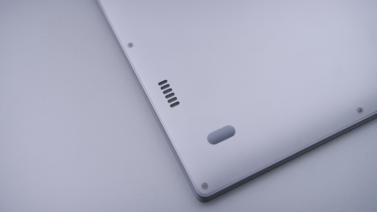 Чи не найкраще розташування динаміків в цьому ноутбуці, знаходяться отвори на нижній частині корпусу. Якщо ноутбук стоїть на столі, звук буде відбиватися від поверхні столу і звичайно ж буде невелика деформація звуку, цього не уникнути, але саме звучання в цілому гарне. Я думаю, що таке розташування було обрано в силу збереження дизайну ноутбука, але, якщо ви використовуєте в більшій мірі навушники, тоді це не стане для вас якоюсь проблемою.